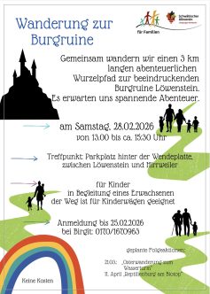 Wanderung zur Burgruine in Löwenstein – Junge Familien Sa., 28.02.2026, Uhrzeit: 13:00 - 15:30 iCalendar Mit dem Laden der Karte akzeptieren Sie die Datenschutzerklärung von Google.Mehr erfahren Karte laden Google Maps immer entsperren zur Übersicht