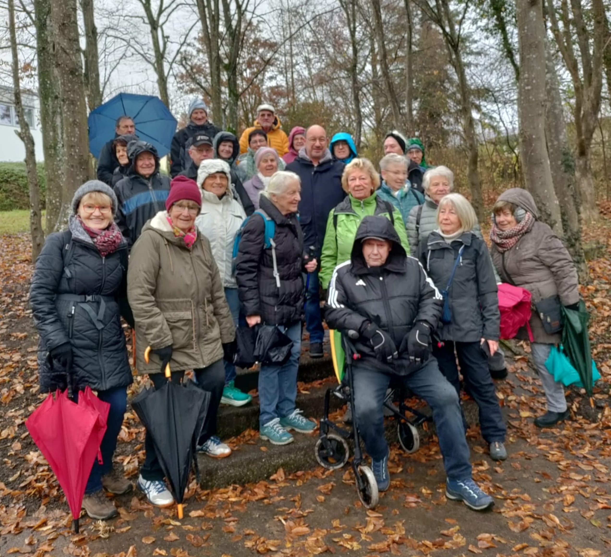 Die Seniorengruppe des schwäb. Albvereins OG Mainhardt war bei seiner Novemberwanderung auf dem Panoramaweg Hagenbacher Ring in Schwäb. Hall unterwegs. Mit Schirm und Kapuzen haben die Wanderer dem nassen Wetter getrotzt.
